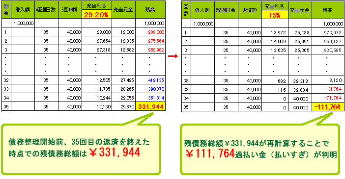 「過払金」とは、自身の借金の利息を法律(利息制限法)の上限利息で計算し直すと既に完済状態になっており、逆に払い過ぎているお金のことをいいます。本来は払い終わってます。高い利率のまま返済していくと、払い過ぎになります。 ■100万円を借入れ、40,000円を35回返済したケース 当事務所で再計算した所、既に元金は完済し、逆に111,764円ものお金を払いすぎていることが分かりました。Uさんはその場で、過払金の返還を当事務所に依頼しました。 すると、次の日から取立て・返済要求が止まりました。司法書士等の法律家による債務整理を行う場合、貸金業者に対して手続開始の通知を行うと借金の取立てがとまる効果もあるのです。そして、手続きを進めたUさんの借金はすべてなくなり、半年後、手続完了時点では、払いすぎていたお金も返ってきました。おまけに、その半年間に支払に充てていたお金が貯金として残りました。今ではUさんは、借金とは無縁な生活を送っています。