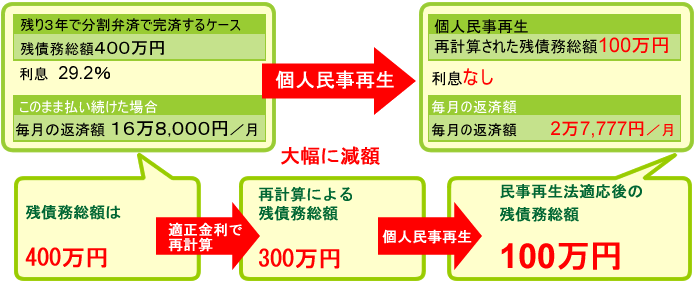債務整理(任意整理)は、利息制限法で再計算した額を基準にして借金の見直しを図ります。そして、再計算した後で残った借金を分割で返済していく際は、毎月の返済時の利息はカットされることになります。
