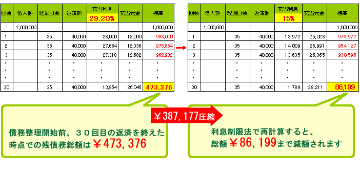 CASE 1 債務整理をすると借金が減額するってどうして? 〜利息制限法〜 (100万円を借入れ、40,000円を返済しつづけたケース)